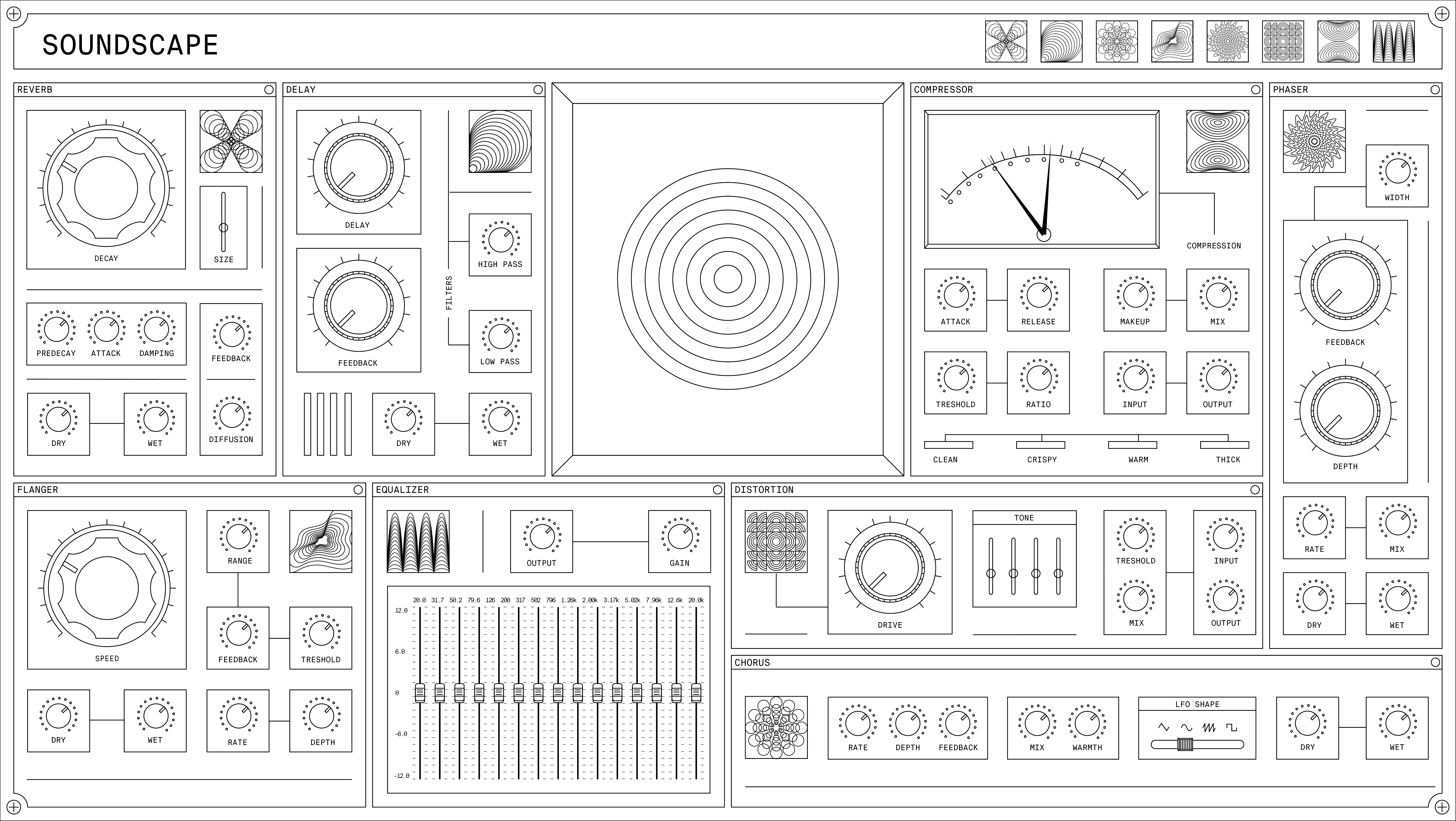 "Soundscape" is a thesis project that analyzes the interface and graphic design of electronic music instruments. This editorial endeavor began as a research project focused on exploring the graphical design of electronic instruments. The research delves into a variety of topics, including the principles of sound visualization, the analysis of control elements, and the layout design of electronic music interfaces. Additionally, the project considers the graphic elements that shape these artifacts.
